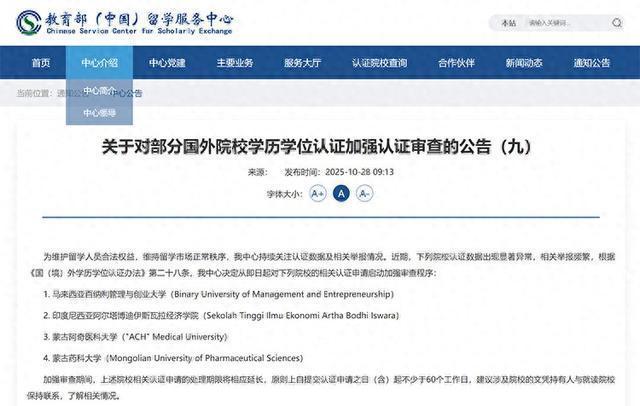 10月28日,教育部留学服务中心发布《关于对部分国外院校学历学位认证加强认证审查的公告(九)》杨帆配资,决定对4所海外院校的相关认证申请启动加强审查程序。